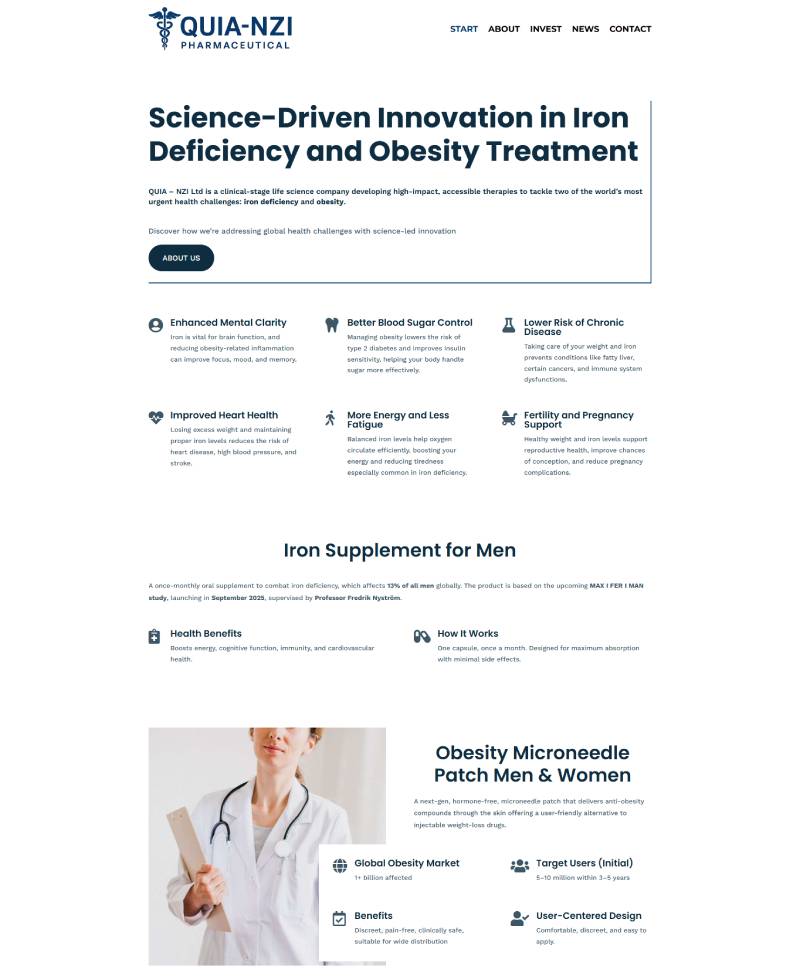 Quia NZI är ett Life Science-bolag i klinisk fas som utvecklar banbrytande terapier för två av världens största hälsoutmaningar: järnbrist och fetma. Deras innovationer inkluderar bland annat en unik månatlig oral järntablett och ett hormonfritt plåster med mikronålar för viktminskning. Venture Vault stöttar Quia NZI som operativ ägare med fokus på bolagets digitala infrastruktur och strategiska förberedelser inför framtida kliniska milstolpar och marknadslansering.